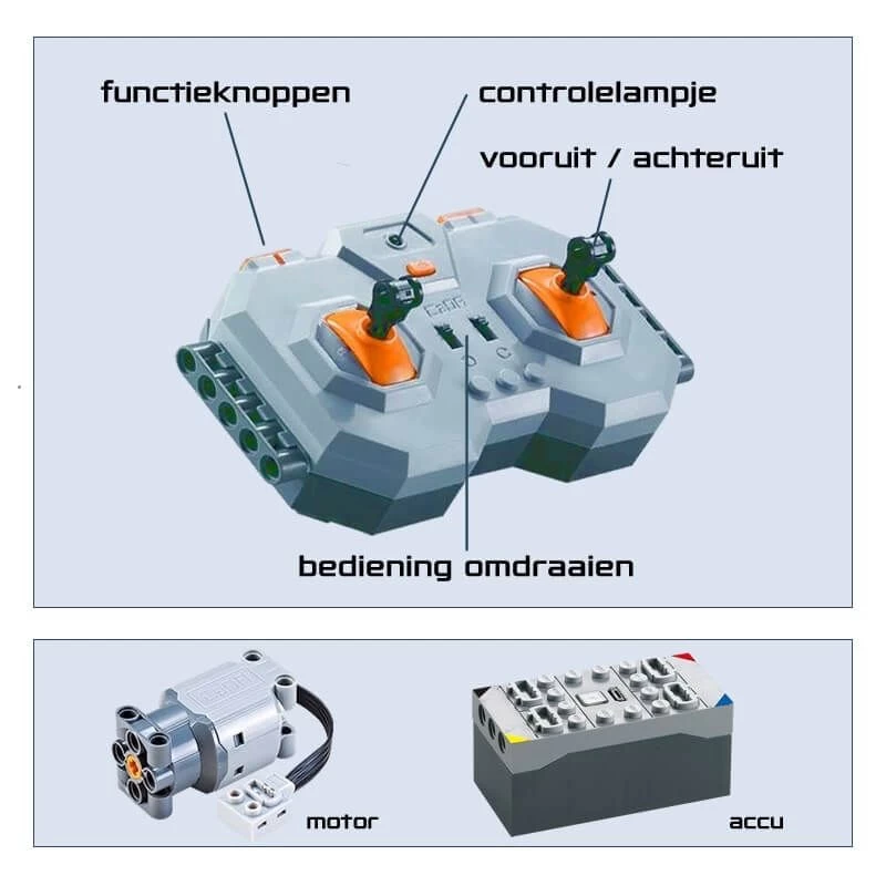 Deze technische bouwset wordt geleverd met een afstandsbediening waarmee je de 2 rupsbanden van de RC Robot of RC robotauto afzonderlijk kunt besturen. Zo kun je dus naar voor, achter of links- of rechtsom draaien. De afstandsbediening heeft een bereik van ongeveer 20 meter en is voorzien van een 2,4GHz zender wat betekend dat je geen last hebt van storingen van andere apparaten. Er gaan 2 AA Alkaline batterijen in de afstandsbediening, deze worden niet meegeleverd.