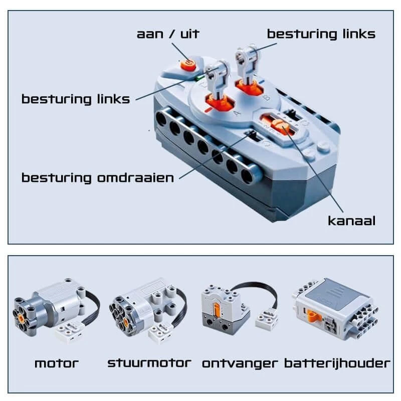 Wanneer je klaar bent met het bouwen van deze technische bouwset, kun je ook echt met je bestuurbare zijspan motor rijden. Met behulp van de meegeleverd afstandsbediening welke is uitgerust met een 2,4GHz zender kun je zonder storingen van andere apparaten je bestuurbare zijspan motor overal heenrijden. De afstandsbediening heeft een bereik van ongeveer 20 meter. Er gaan 2 AA Alkaline batterijen in de afstandsbediening en 6 AA Alkaline batterijen in de batterijhouder, deze worden niet meegeleverd.