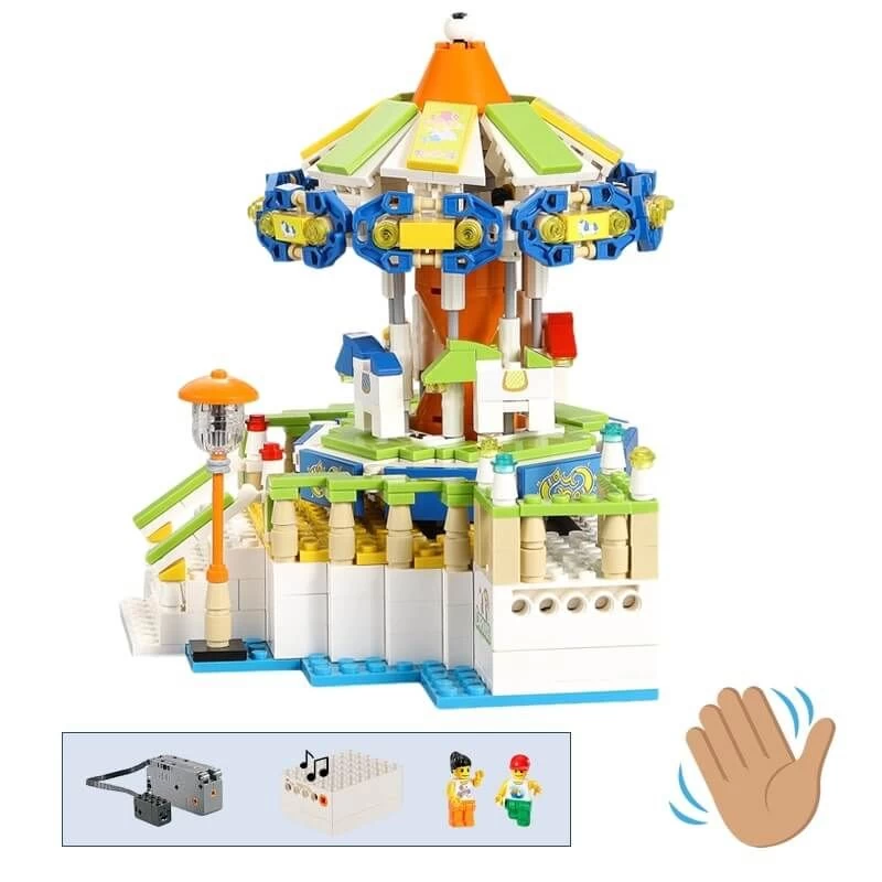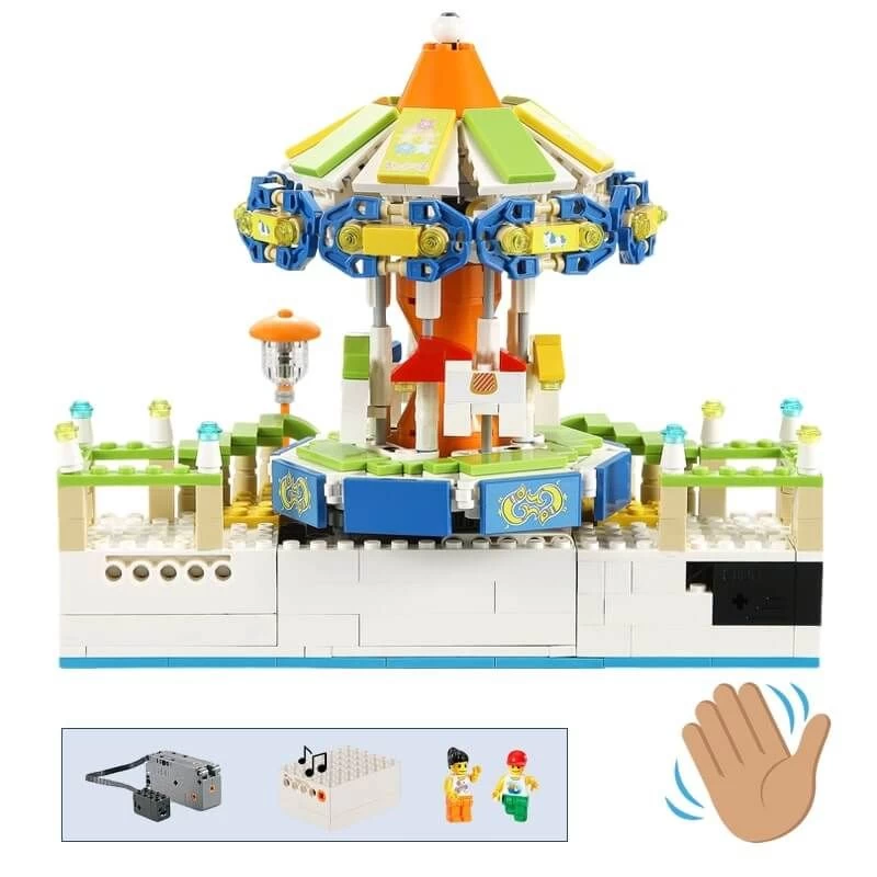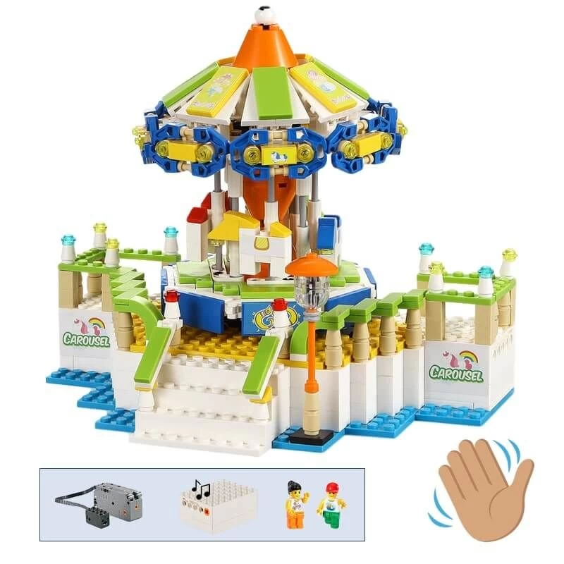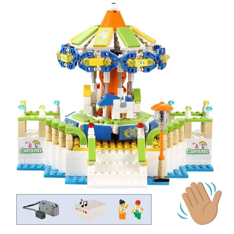 Maak je eigen pretpark of kermis met deze technische bouwset van Cadabricks! Deze draaimolen draait uiteraard ook echt rond en is zelfs uitgerust met een bewegingssensor waarmee je de draaimolen kunt starten en stoppen. Ook gaan de paarden op de draaimolen op en neer zoals bij een echte draaimolen en wordt er zelfs nostalgische draaimolenmuziek bij afgespeeld waardoor het voelt alsof je echt op een kermis of pretpark bent. Met dit technische bouwpakket heb je superveel bouw en speelplezier.