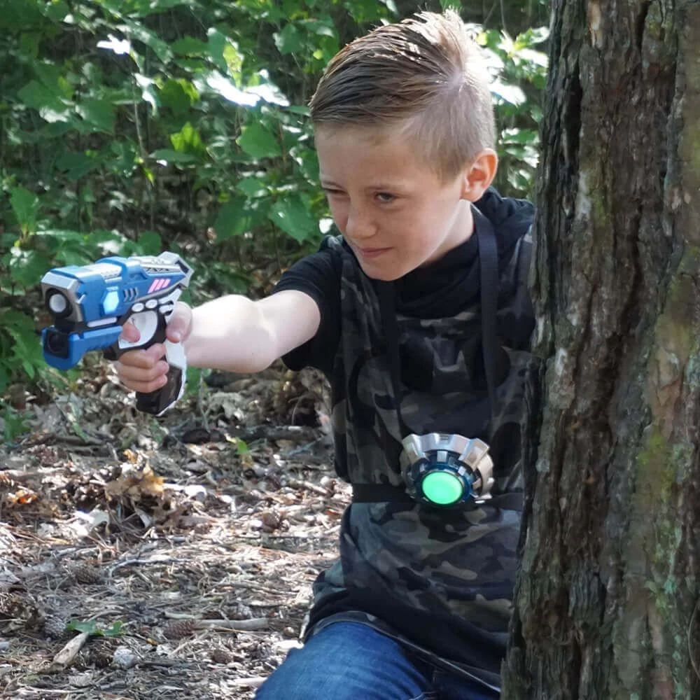 Met deze lasergame set heb je alle functies van een duurdere lasergame set, maar dan tegen een lagere prijs! Met deze stoere KidsTag lasergame set kun je binnen of rondom je huis lasergamen zolang je wilt. Deze KidsTag lasergame set is eenvoudig in gebruik en heeft geen lastige kabel tussen het vest en het laserpistool zoals bij bijvoorbeeld Laser X. Deze laserpistolen hebben supergave licht en geluidseffecten en er kunnen 4 verschillende munitiesoorten en teamkleuren worden ingesteld.