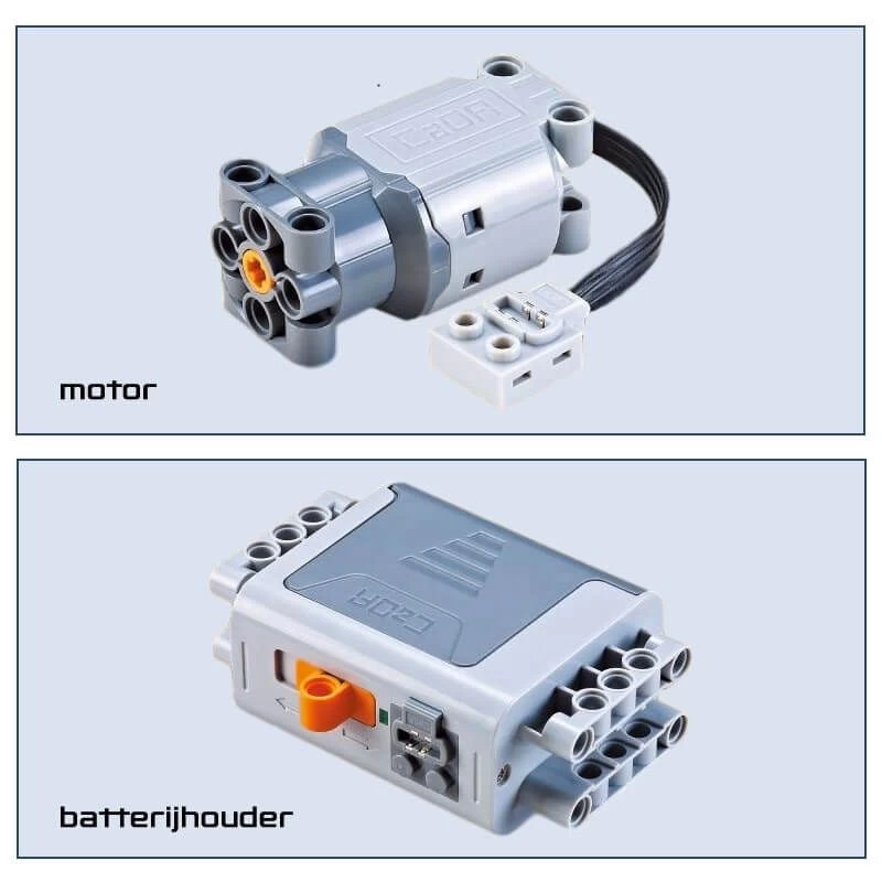 Nadat je klaar bent met bouwen van deze technische bouwset wil je uiteraard zien wat er gebeurt wanneer de motor gestart zou worden. Met behulp van de meegeleverde batterijhouder en motor kun je de legermotor starten en de motordelen ook echt zien draaien terwijl hij op de standaard staat. Er gaan 6 AA Alkaline batterijen in de batterijhouder, deze worden niet meegeleverd.