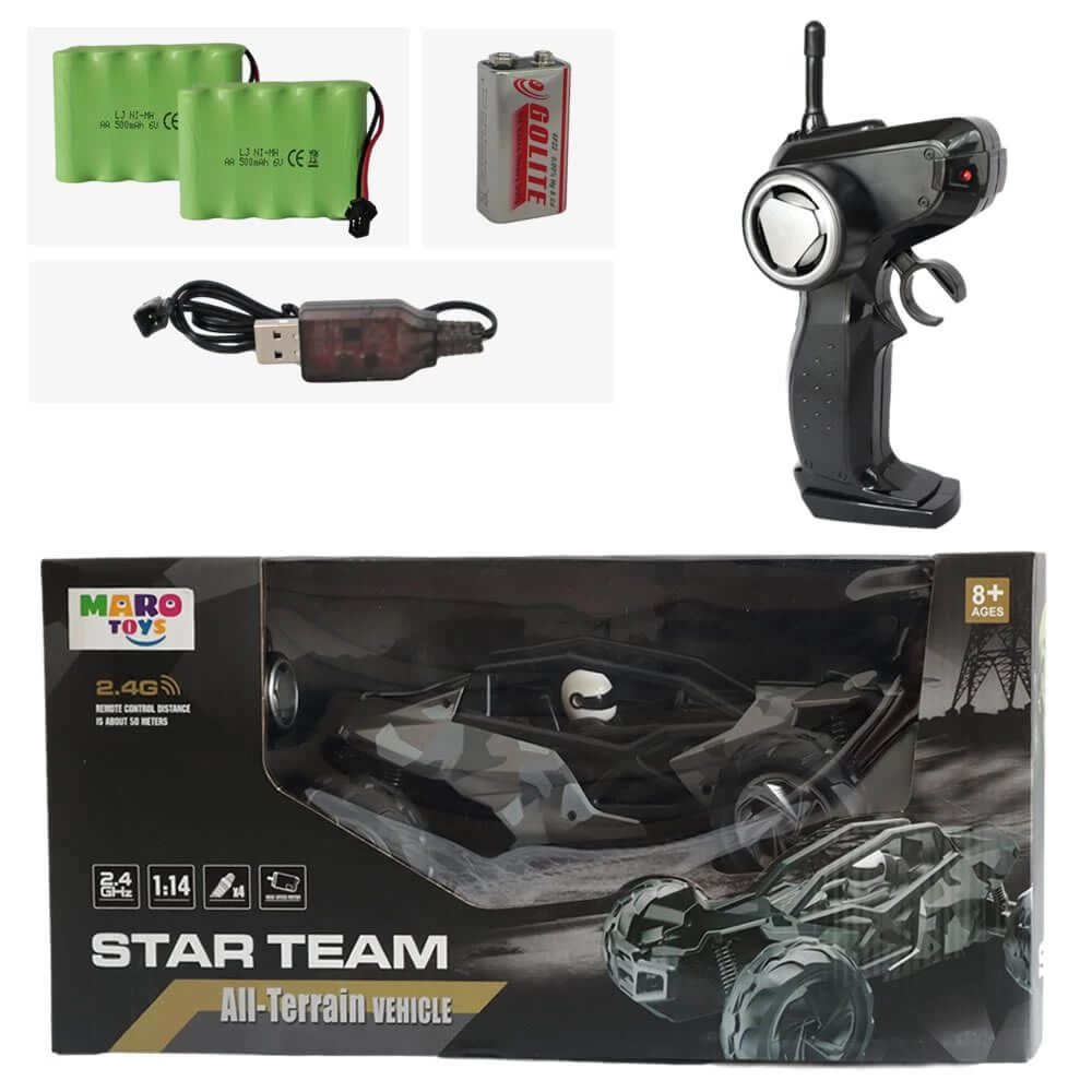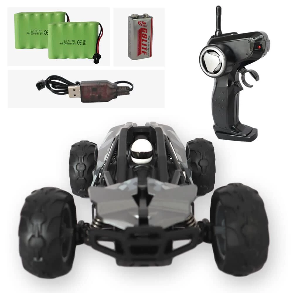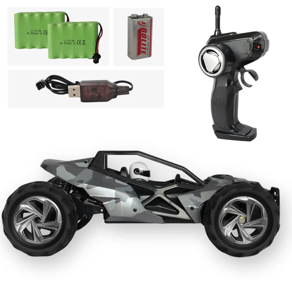 Compleet pakket inclusief 2 accu’s en 9V batterij voor de afstandsbediening. De maximale snelheid van 25 km/h is ideaal voor kinderen van 8 tot 12 jaar. Door zijn stoere grijze camouflage kleuren zul je zeker opvallen. Behalve dat hij er supergaaf uitziet is deze RC auto ook nog eens verrassend snel voor een RC Auto uit deze prijsklasse. Omdat hij geleverd wordt met 2 batterijpacks, kun je extra lang spelen.
