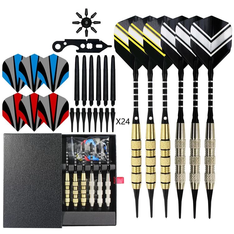 Deze dartpijlen set bestaat uit 6 softtip pijlen van 18 gram voor elektronische dartborden. De set wordt geleverd met zeer veel accessoires. Naast de 6 pijlen krijg je bij deze dart set ook nog 24 reserve dart tips, 6 reserve dart shafts, 12 dart flights in 4 verschillende kleuren, 8 dart flight beschermers én een handige dart tool je dartpijl stevig aan te draaien. De softtip dartpijlen zijn geschikt voor zowel beginnende als gevorderde darters.