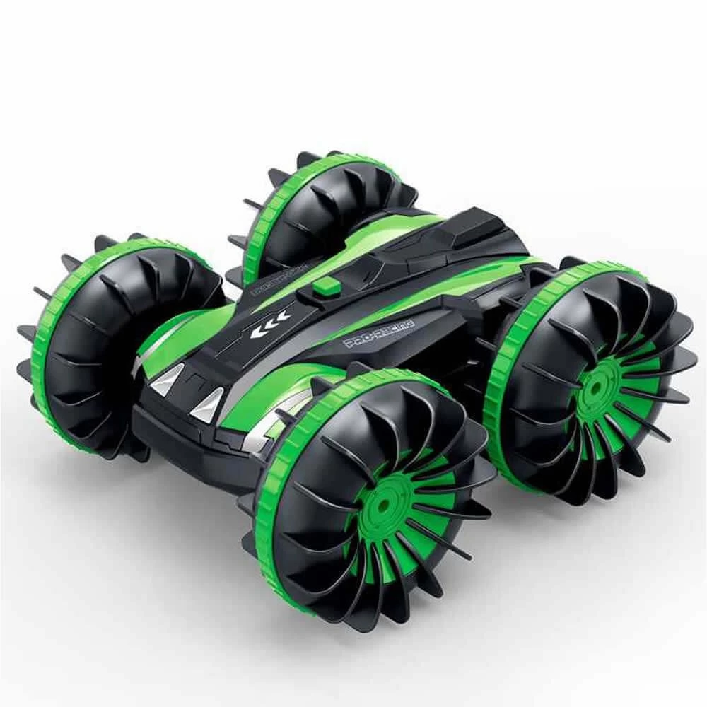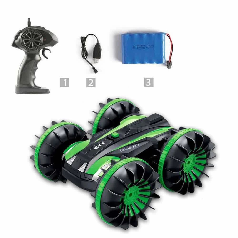 Deze stunt auto kan op het land of in het water, je kunt op allerlei terreinen plezier beleven! Doe de tofste flips en stunts op de beide kanten van de auto. Ook kan de auto balanceren op de 2 achterbanden en 360 graden ronddraaien. De extra grote banden zijn speciaal gemaakt om op meerdere ondergronden te rijden. Deze stunt auto kan zelfs rijden in de sneeuw of varen in het water!